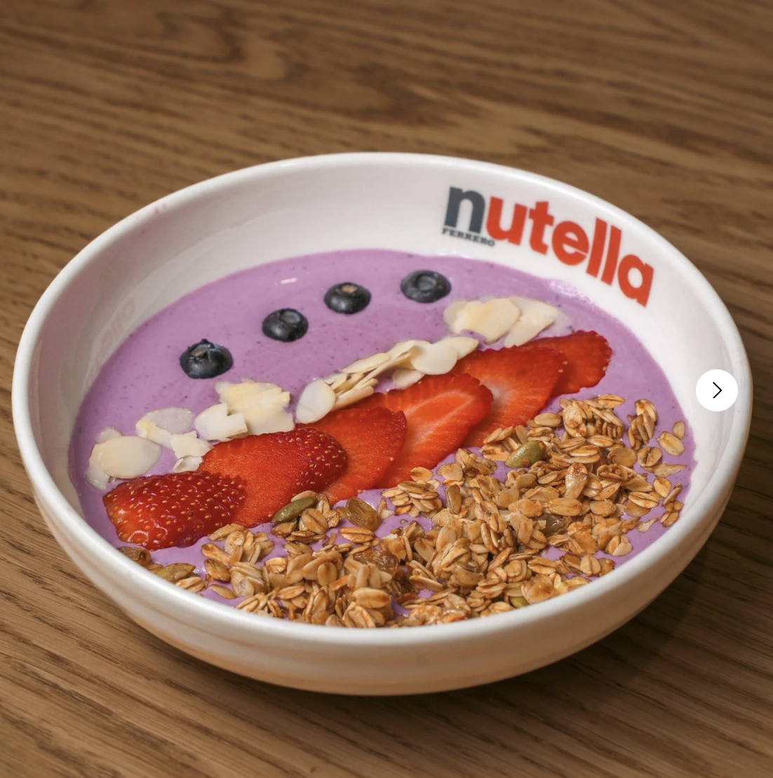 Греческий йогурт, черника, сахарная пудра, ваниль, свежие ягоды, лепестки миндаля, гранола