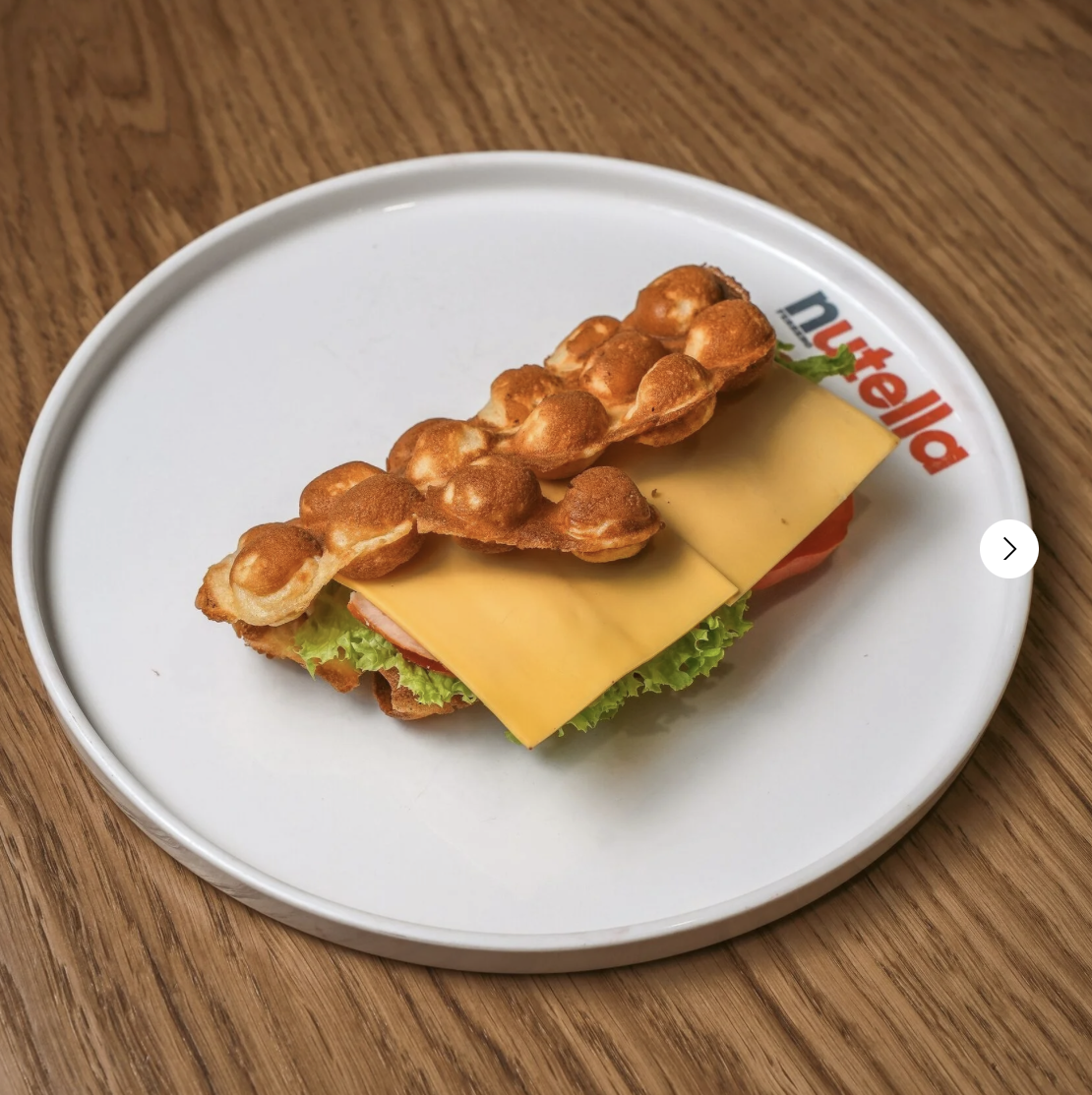 Гонконгская вафля, соус цезарь, лист салата, томаты, ветчина из индейки, сыр